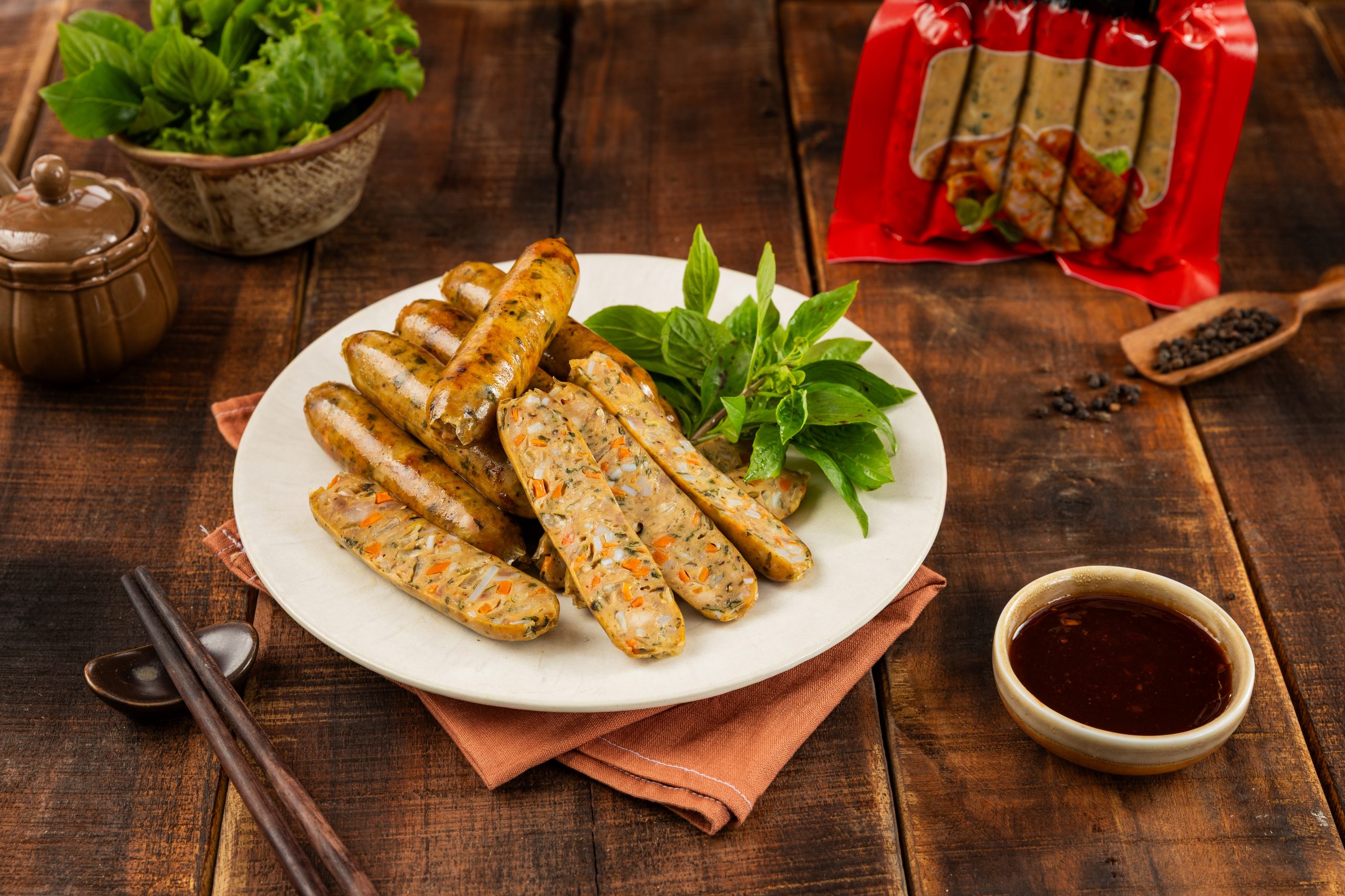 - Thành phần: Thịt heo, sườn sụn, sụn gà, cà rốt, hành tây, hạt tiêu, muối, đường, rau thơm, vỏ collagen, đạm đậu nành, protein heo, chất điều vị 621, chất ổn định 450(iii), 451(i), 450(i), 452(i), maltodextrin, dầu nành, chất bảo quản 262(i).